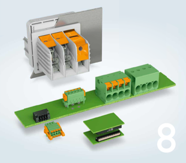 - Bornes para carril y conectores para placas de circuito impreso.